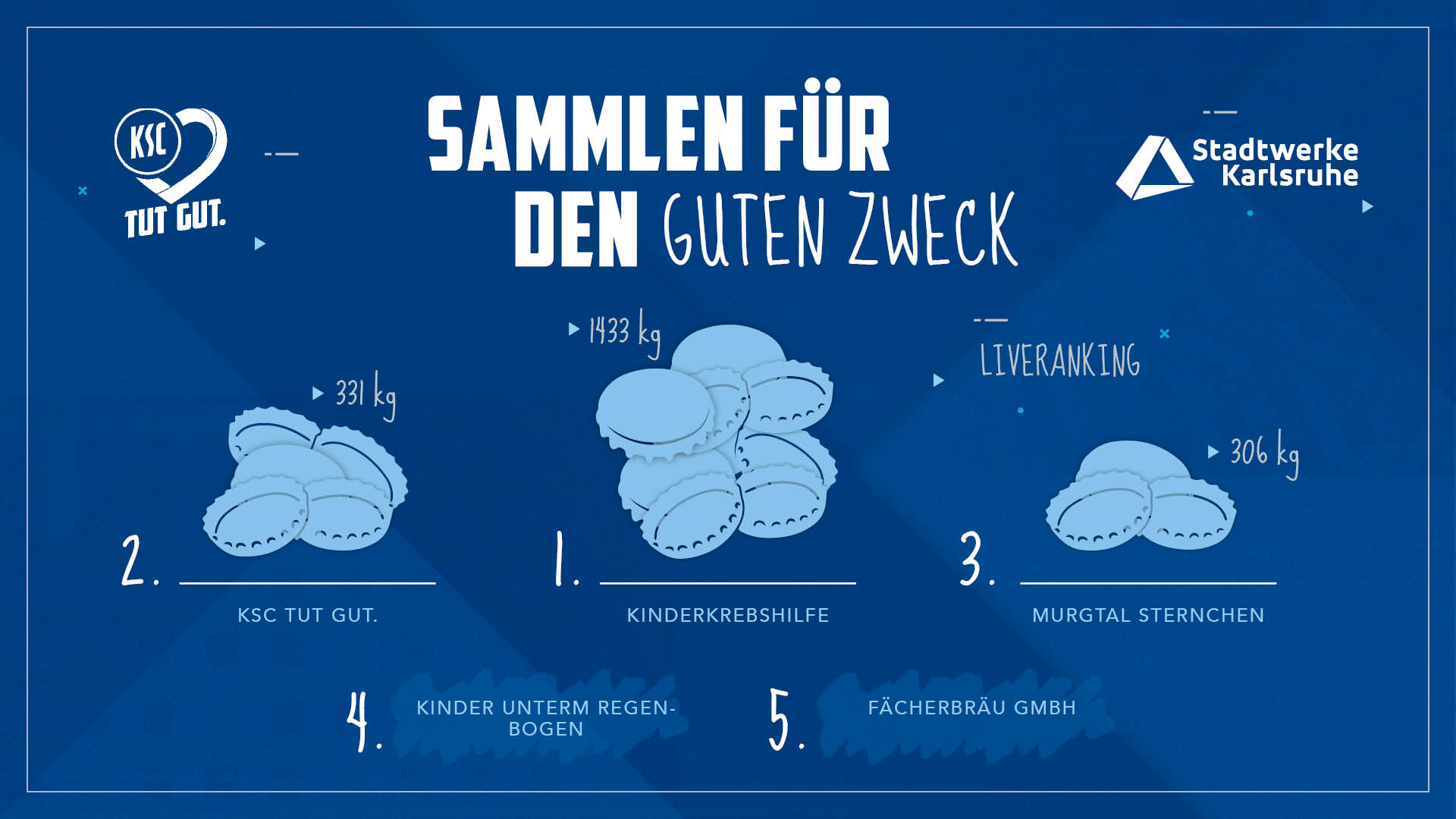 Das Live-Ranking zeigt übersichtlich, für welche fünf Organisationen aktuell die meisten Kronkorken gesammelt wurden. Die Werte basieren auf den tatsächlich abgegebenen und registrierten Mengen in der KSC-Fanwelt.
